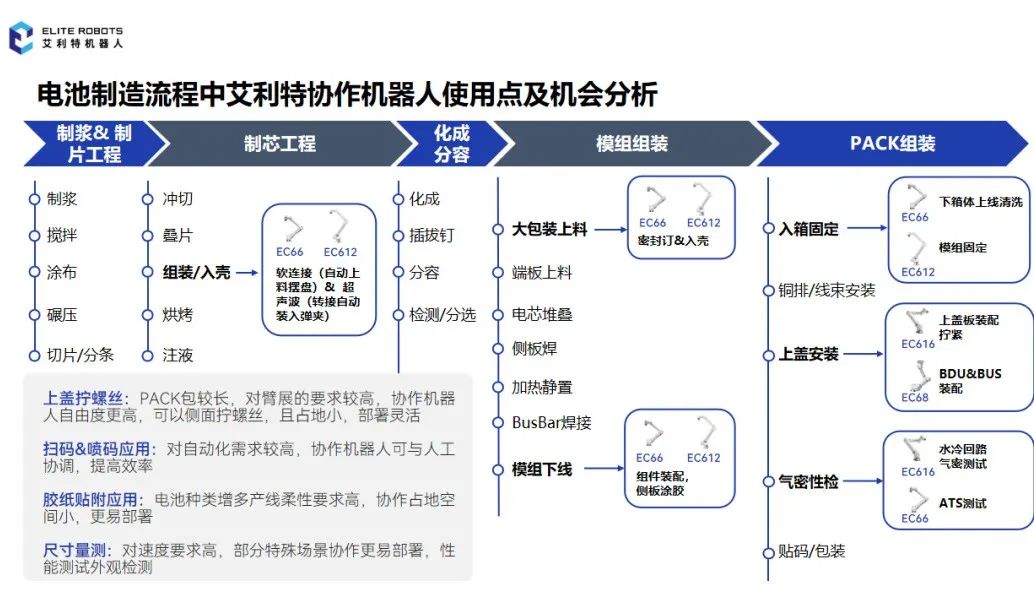 PACK段:主要應(yīng)用于極耳裁切、清洗、貼膠、檢測等工藝段,該工藝段對臂展要求高,協(xié)作機器人臂展較大,部署更便捷。