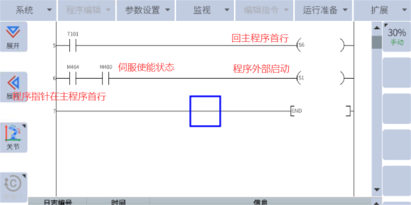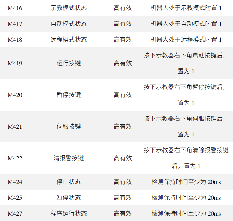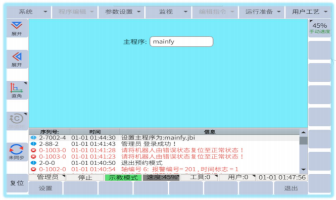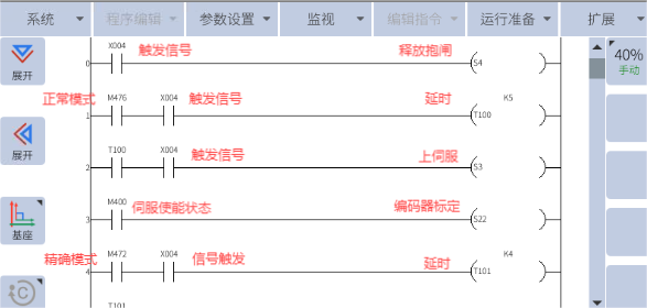 觸發輸入信號(X004),機械臂即可完成清除報警,抱閘,上使能,標定進入精確模式,運行主程序操作,再次觸發X004可暫停,如果機械臂報警,觸發(X004)也可清除報警,回主程序首行運行。