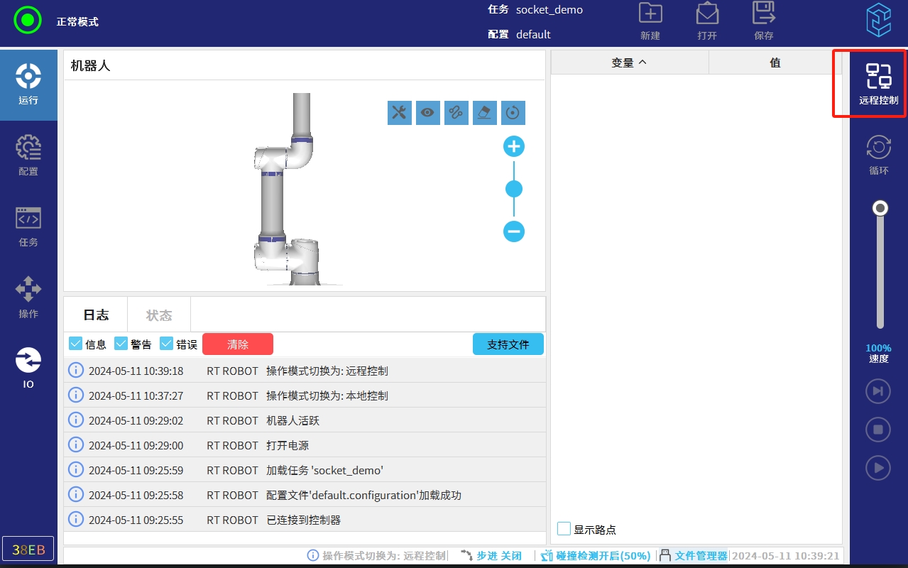 外部設備可以往30001直接發送機器人腳本,機器人處于遠程模式,機器人就會運動。