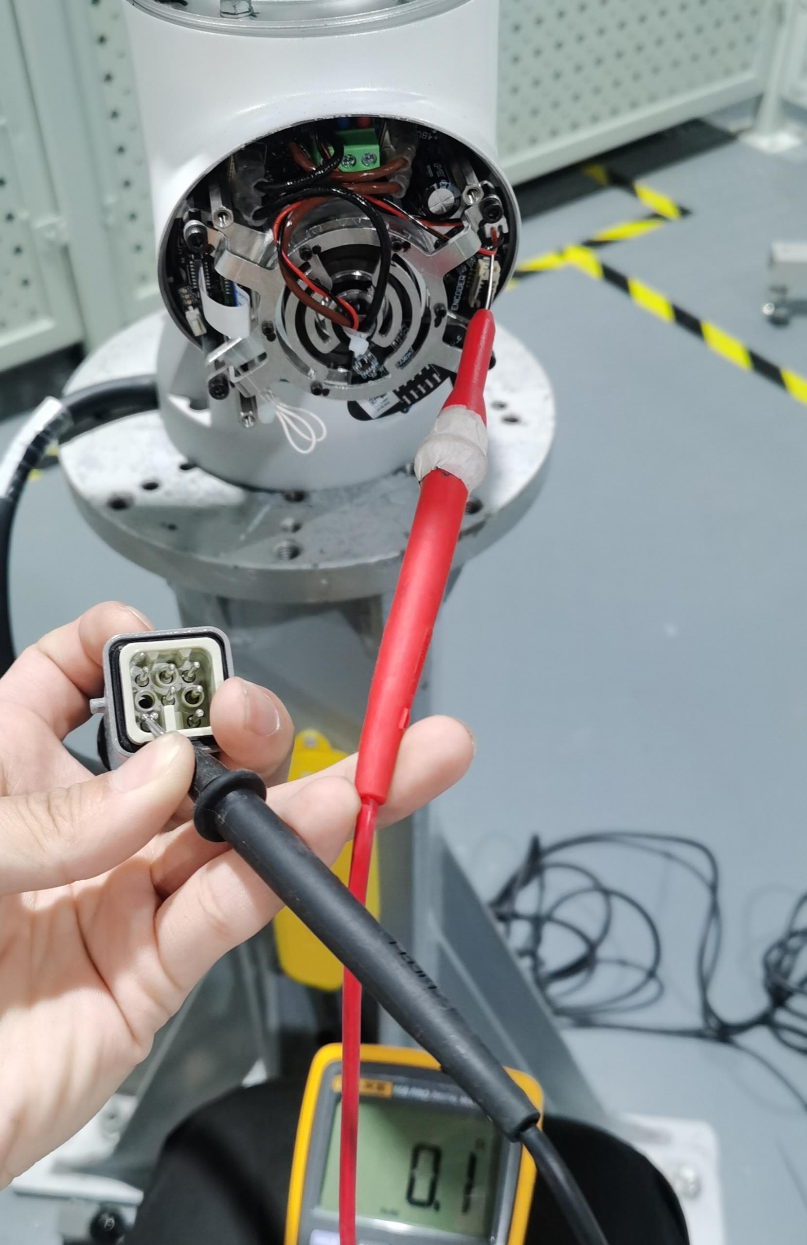 本體與控制柜連接,打開任意關節端蓋,萬用表打到歐姆檔,測量485+與485-電阻是 否在60歐姆左右,偏差太大或太小就有問題.如果有問題,測量兩個相鄰關節之間單線485+,單線485-的阻值,值在1歐姆左右即可