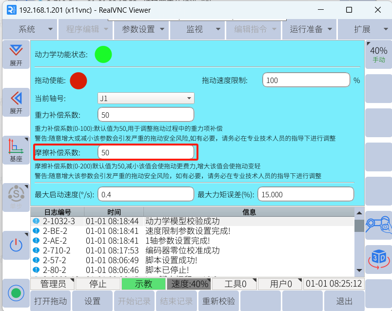 打開拖動,拖動某個關節時感覺摩擦力較大,拖動比較費力,可將該軸的摩擦補償系數調大,參數值越大,摩擦力越小,拖動越輕松。數值設置的越小,摩擦力越大,拖動越吃力。默認值為 50,建議可設置 60-90 之間,不建議設置到 100,默認50。