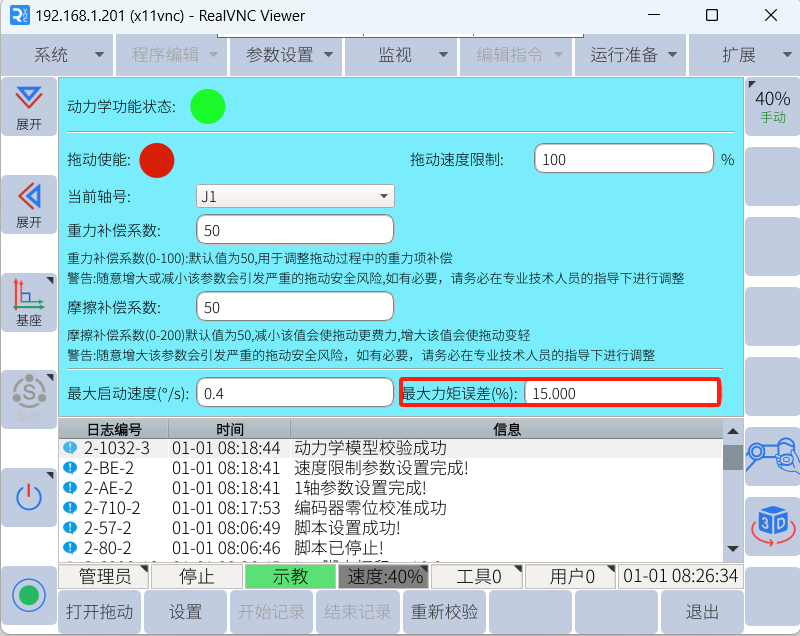 打開拖動后與打開拖動前的力矩差值占打開前力矩的百分比當該百分比大于所設置的百分比時,拖動使能不會被打開且系統提示“力矩校驗失敗,無法打開拖動”。造成的原因: 安裝方式、負載、零位、連桿長度、額定轉矩、減速比、機器人類型錯誤,這需要工程師自行判斷。