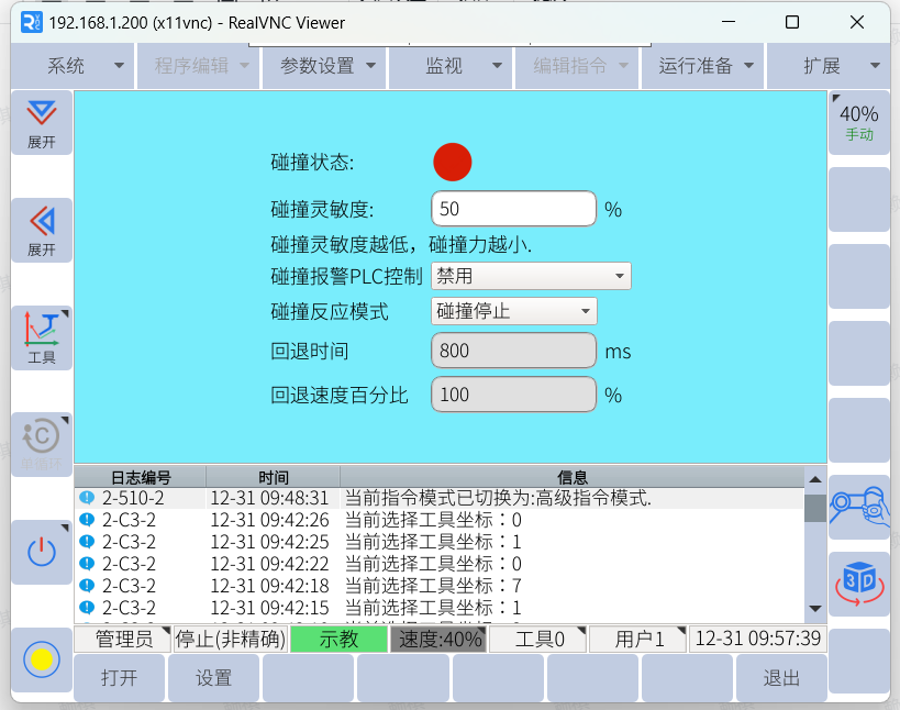 2.  設置百分比要結合機器人當前的負載,速度,姿態,例如機器人速度很快,滿負載,設置20%會導致機器人正常運行報警碰撞,推薦可以先設置50%,后續運行程序逐步更改。