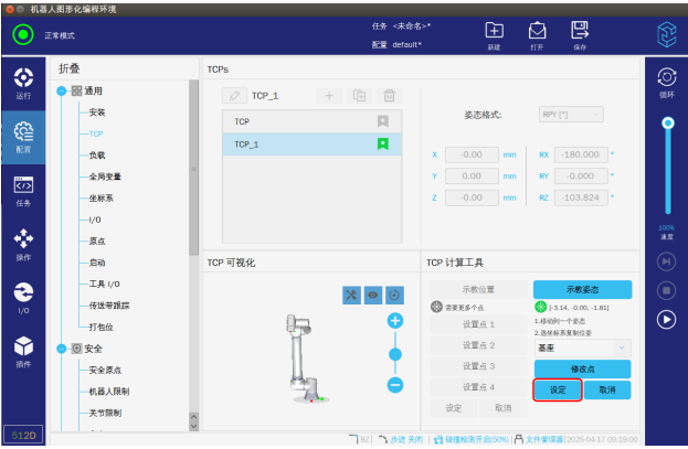 第三步:4個點設置好后,如圖-6所示,點擊設定,新建的TCP就設置好了。如圖-7兩個紅框標記所示,新建的TCP_1與基座標系方向不同。