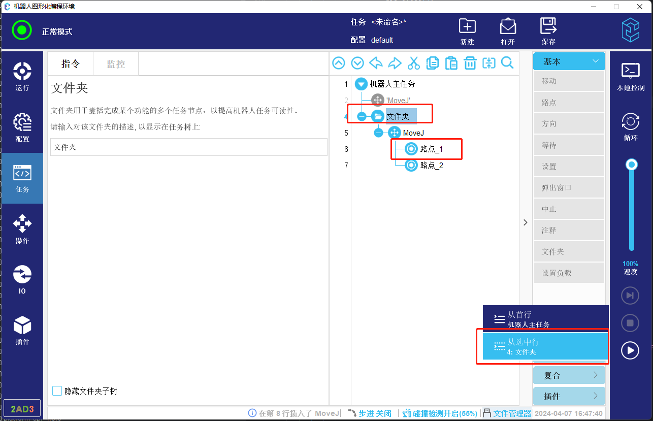 3. 如果起始行不可以作為起始安全位置節點,則會查找該節點上方的節點,如果存在可以作為起始位置的節點,則選做起始位置節點,如果不存在起始位置節點,則會進一步正向查找該節點內部是否存在起始位置節點,如果存在,則作為起始位置。如下方圖-11所示任務,如果選擇第4行文件夾為開始節點,則會找到路點_3作為起始位置。如果文件夾上方如果沒有起始路點,則會向下找到起始點,如圖-12所示則會找到路點_1作為起始位置。