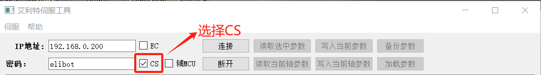 3、由于CS控制器上電后會自動下發部分參數,因此使用該固件時,需要在伺服參數頁面將“使用內部參數"勾選;,選擇需要抑制的伺服(比如一軸需要抑制就選伺服1);