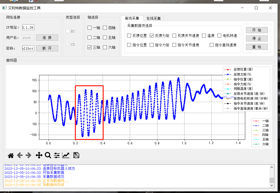 功能:其內主要是對關節的力矩,速度等信息的采集,主要分四個區:網絡連接區,類型選擇區,軸區以及采集區