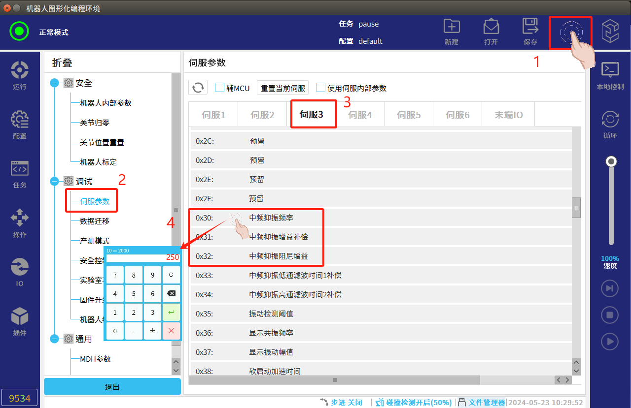 6.開始采集波形時,機器人會進入產測模式,調整參數完成后需要手動退出產測模式