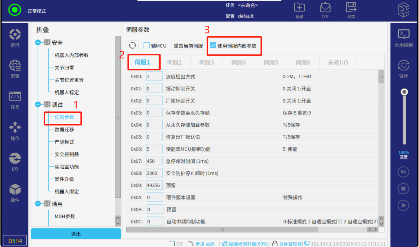 2.伺服參數界面操作流程:(該界面可對關節的伺服參數進行讀取,修改,備份以及加載)