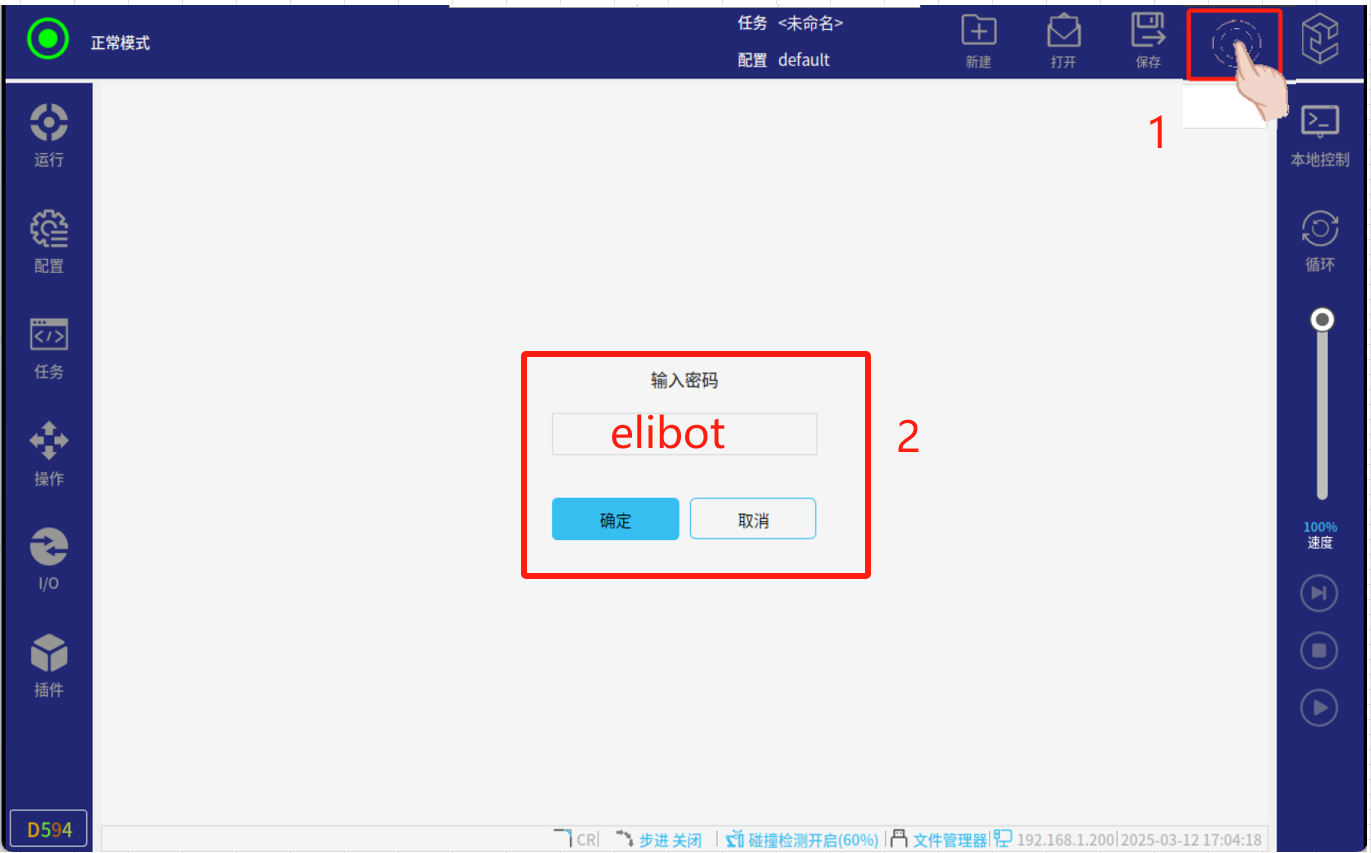 1.在正常模式下點擊如圖4-8所示右上角紅框標注區域(連續快速點擊 5-8 次)就會出現輸入密碼頁面界,然后輸入密碼:elibot,進入專家模式。