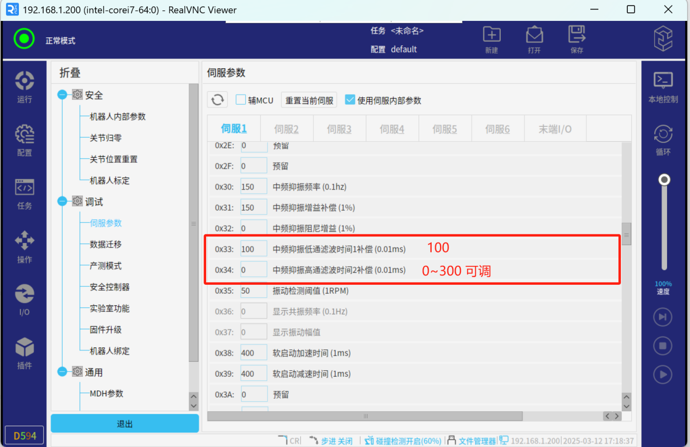 5、將Pn33設置為100,Pn34從0-300可調,用于調整抑制強度,通常設定在100;