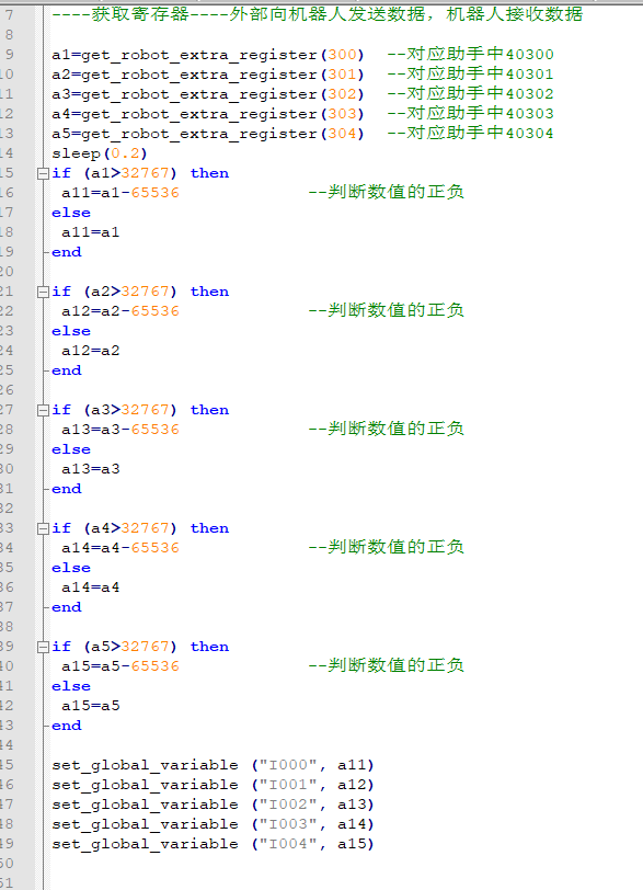 6).機(jī)器人通過全局變量I10-I14,將數(shù)據(jù)寫入寄存器320-324,腳本如下所示