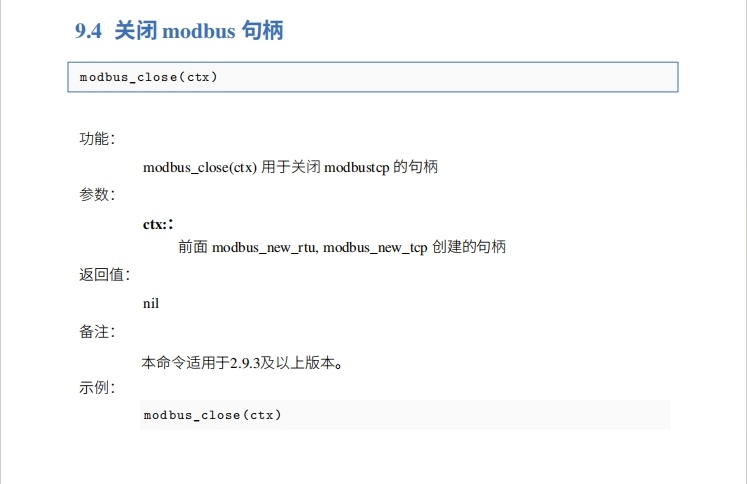 ModBus Master接口常用獲取modbus、連接modbus、關(guān)閉modbus、設(shè)置slave、讀取單個(gè)線圈、寫入單個(gè)/多個(gè)線圈、讀取單個(gè)寄存器、寫入單個(gè)寄存器等指令,本文主要講解以上指令,具體指令詳解如下圖所示,其他指令也可參考EC-lua手冊(cè)ModBus Master章節(jié)