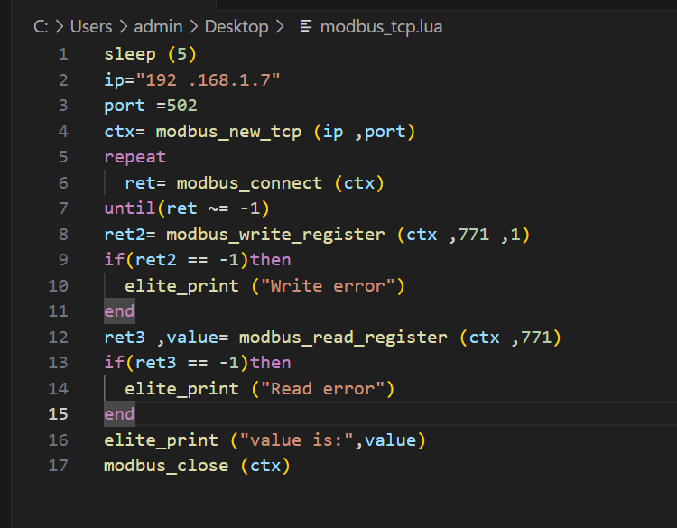 ModBus主站功能通過lua腳本實(shí)現(xiàn),可以參考EC-lua手冊(cè)進(jìn)行使用。其中MODBUS MASTER為已經(jīng)封裝的接口,用戶只需傳入相應(yīng)參數(shù)即可;如有其他特殊協(xié)議要求,可以使用TCP/UDP通訊、485通訊、TCI通訊(工具末端485)和232通訊等。