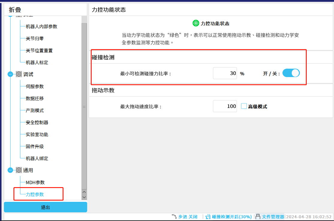 在力控參數欄目,也可修改碰撞靈敏度。修改完成后,點擊退出即可。