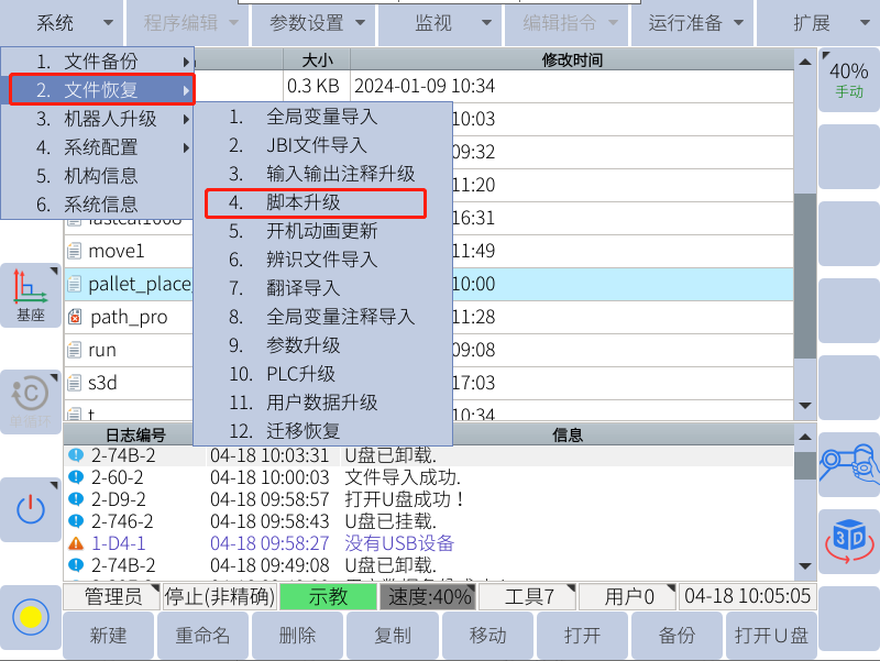 注:只有示教器上顯示u盤圖標的時候才能用來備份和恢復(導入導出相關數據)