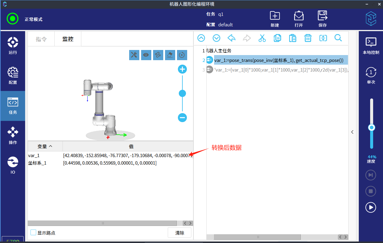根據位姿變換指令,將user坐標系(坐標系_1)下的位姿(下方示例中var_1)轉換成base坐標系下的位姿(var_2)