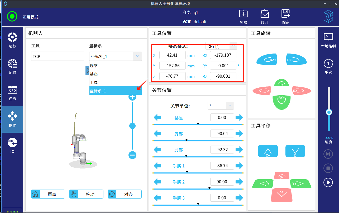 根據位姿變換指令,將base坐標系下的位姿(下方示例中get_actual_tcp_pose())轉換成user坐標系(下方示例中坐標系_1)下的位姿(var_1)